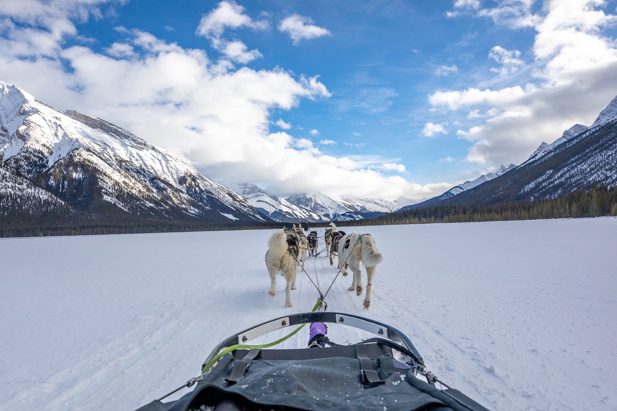 2×3, Alberta, Banff national park, Blue sky, Canada, Canadian Rockies, Dog Sledding, Landscape, Snow, Winter, blue bird