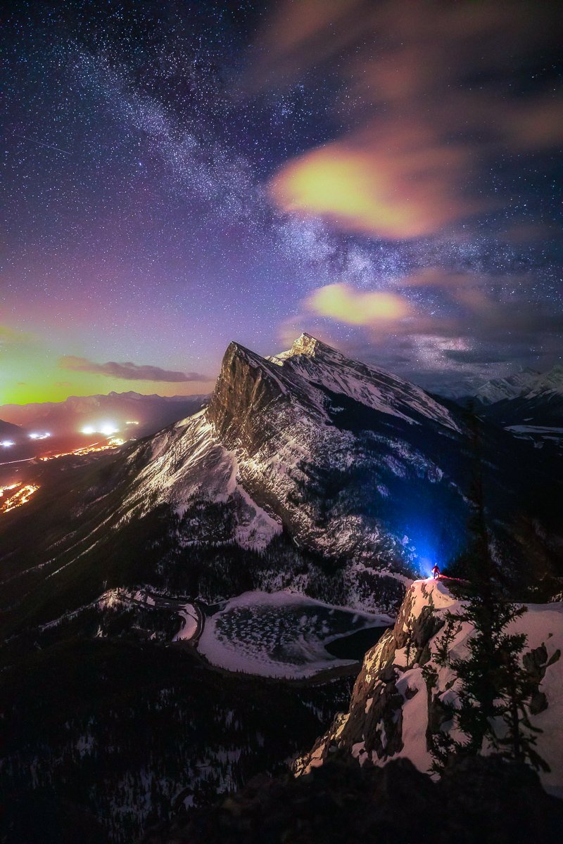 2×3, Aurora Borealis, Banff national park, Canadian Rockies, Lake Minnewanka, Northern Light, self-portrait