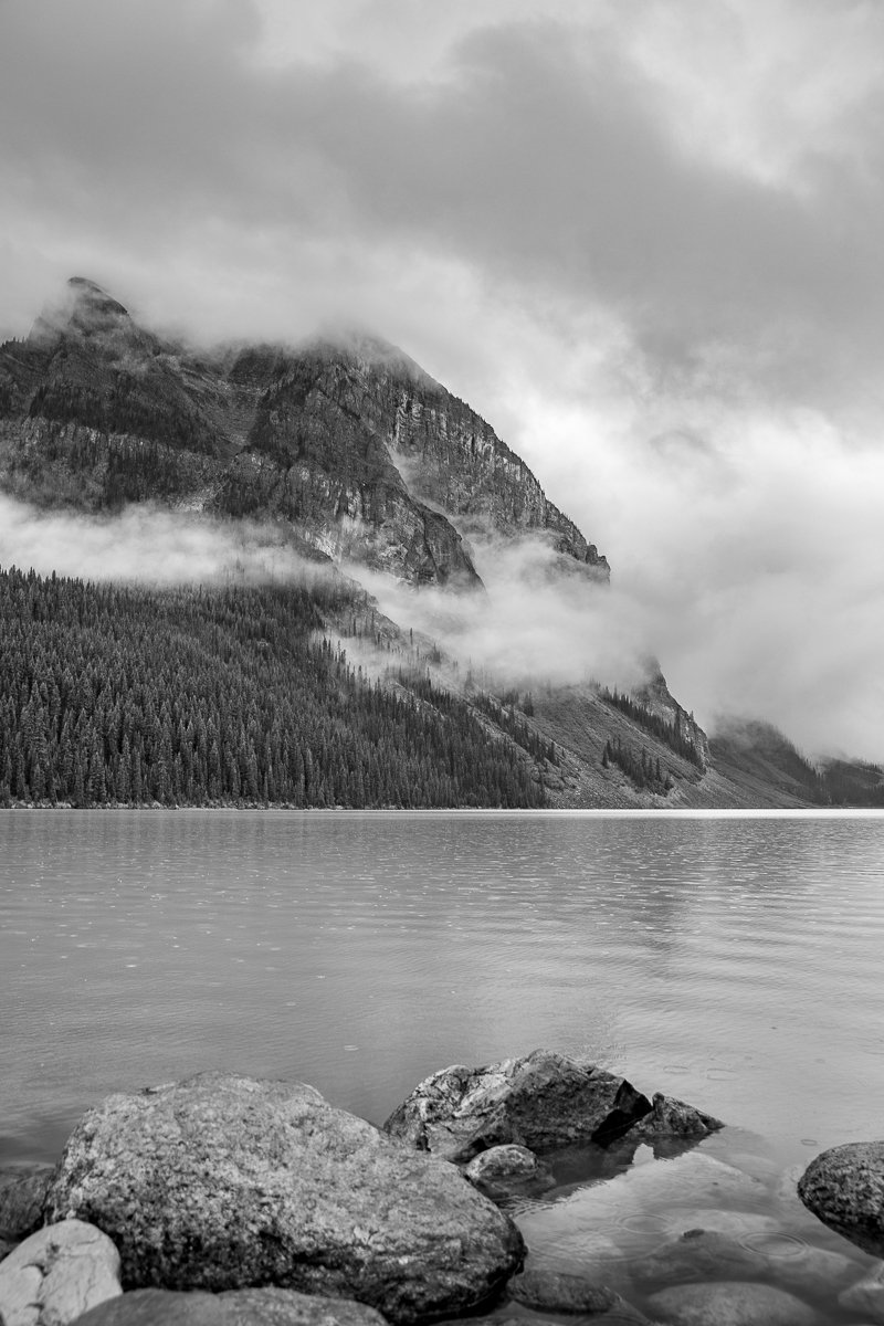 2×3, Alberta, Banff national park, Black and White, Canada, Canadian Rockies, Foggy, Lake, Lake Louise, Mountain