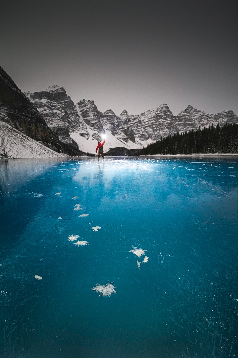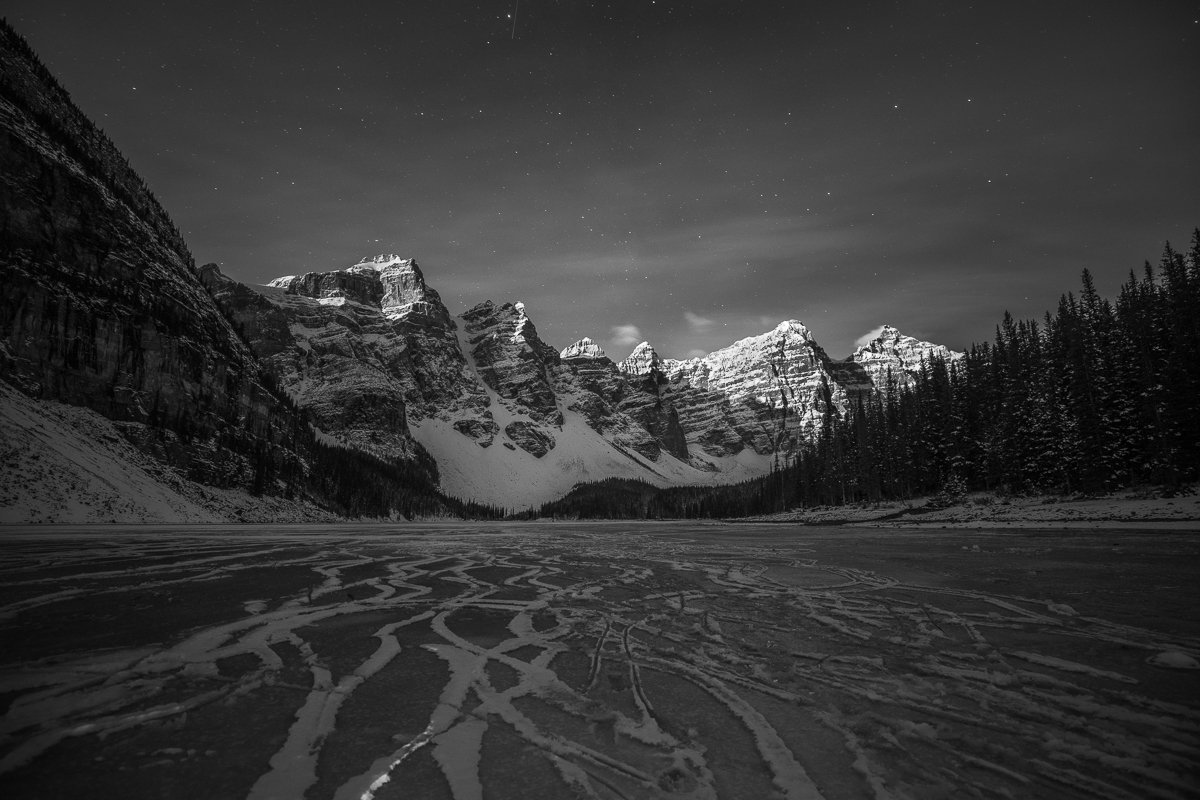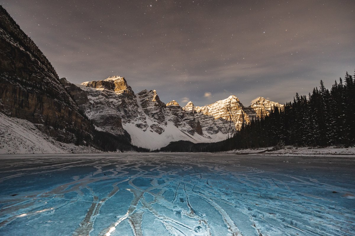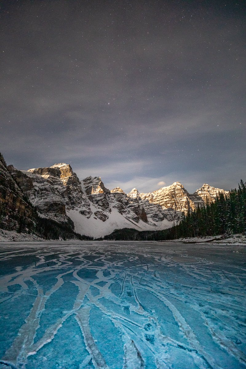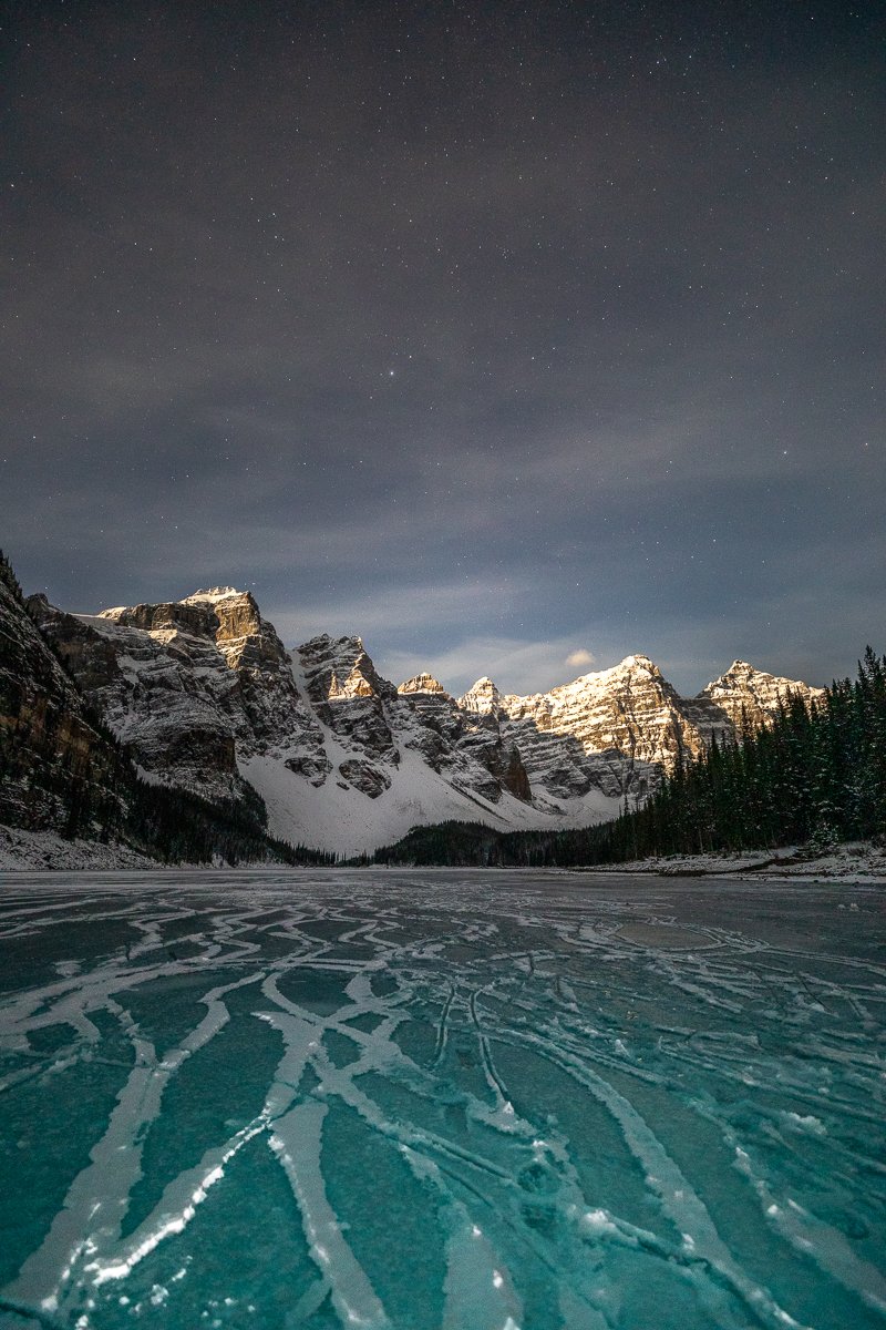 2×3, Alberta, Canada, Canada Rockies, Canadian Rockies, Frozen Lake, Moraine Lake, Night photography, Winter