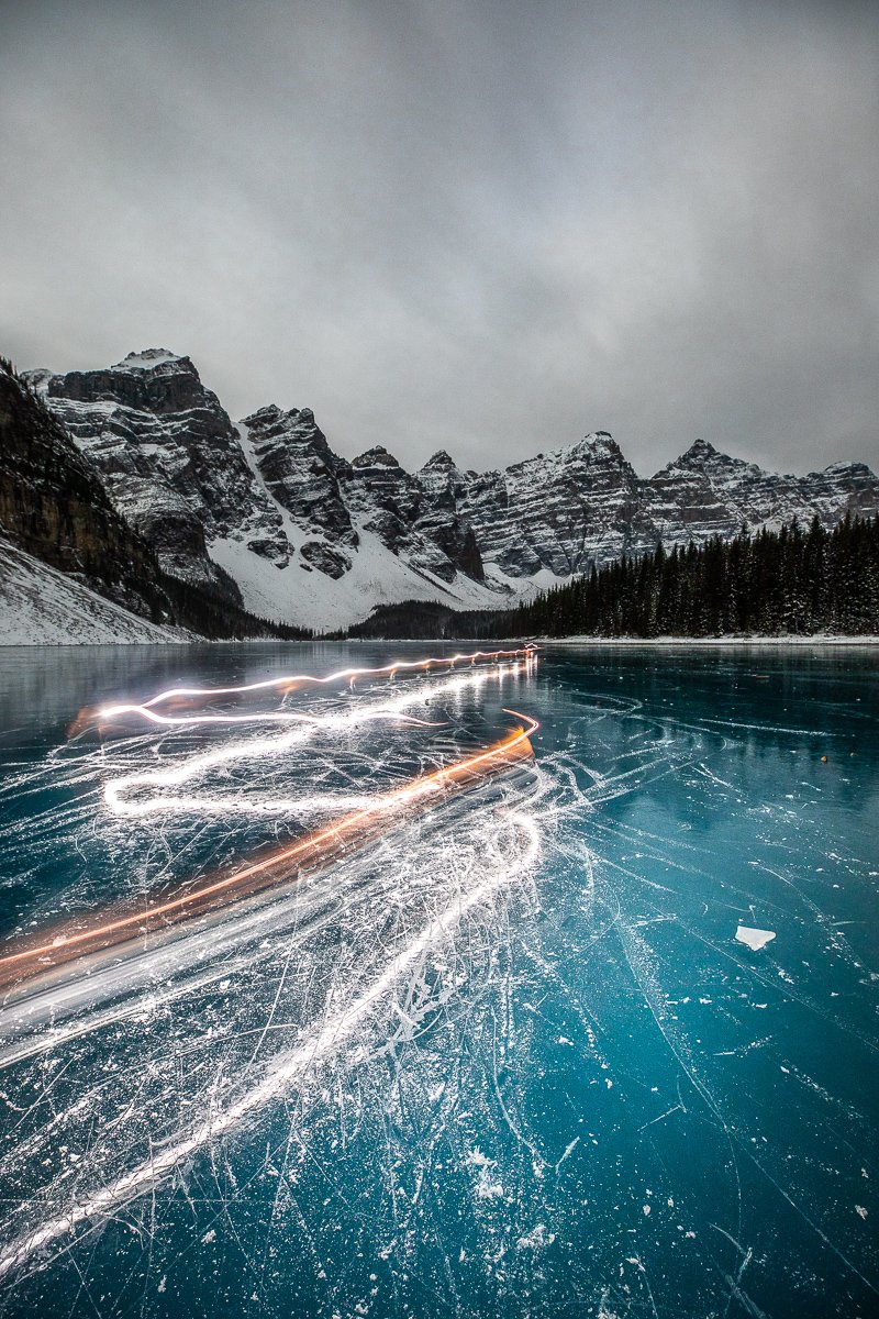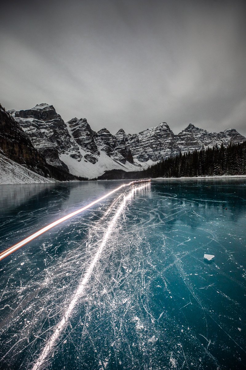 2×3, Alberta, Canada, Canada Rockies, Canadian Rockies, Frozen Lake, Landscape, Light trails, Moraine Lake