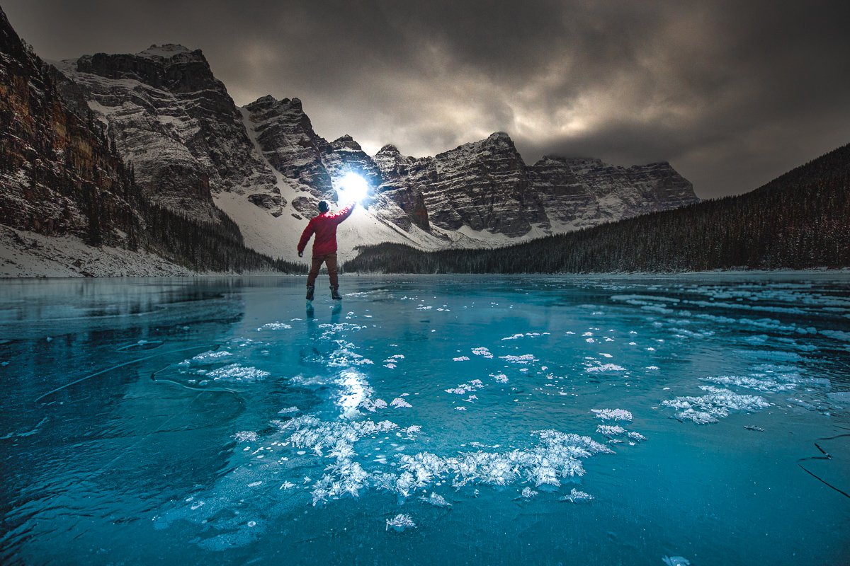 2×3, Alberta, Canada, Canada Rockies, Canadian Rockies, Frozen Lake, Landscape, Moraine Lake, self-portrait