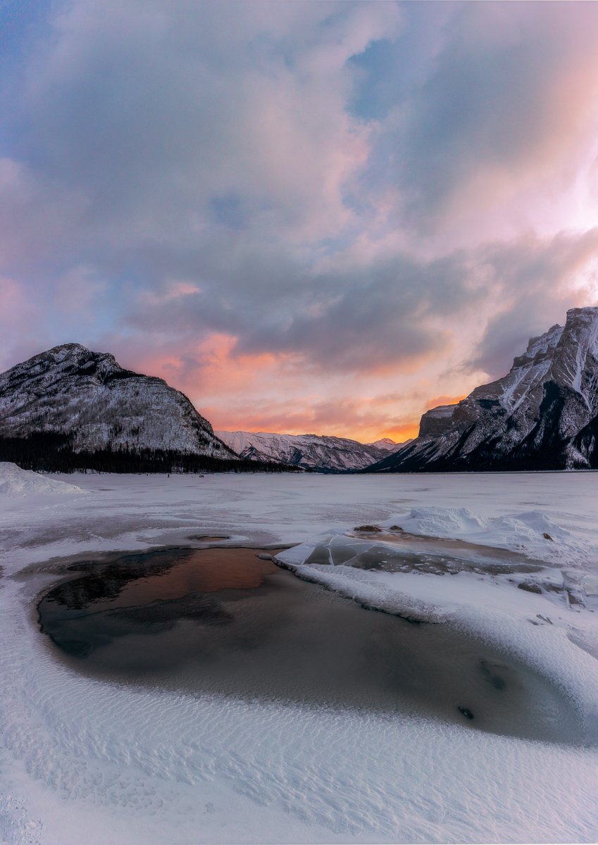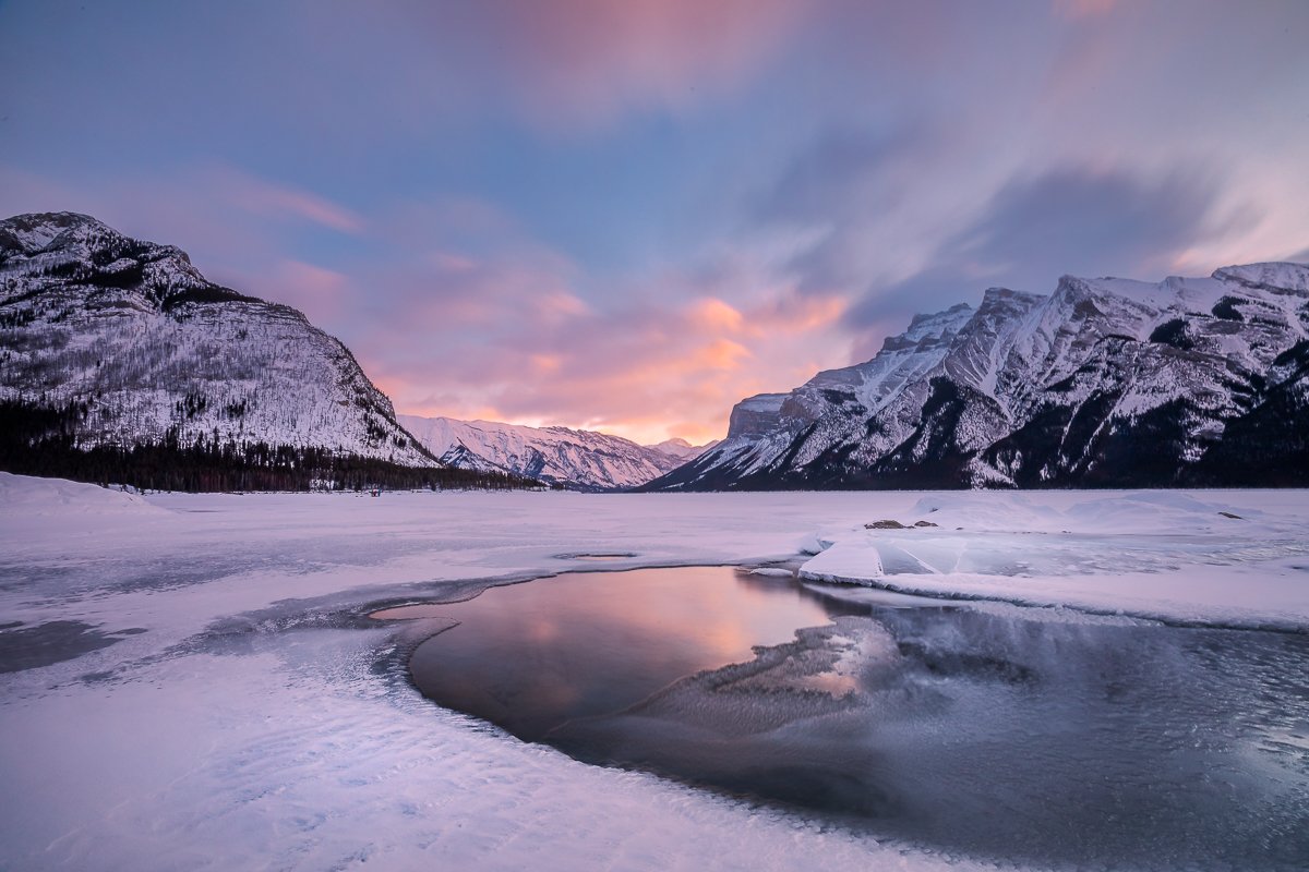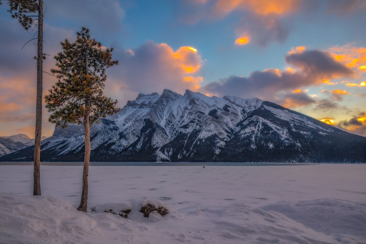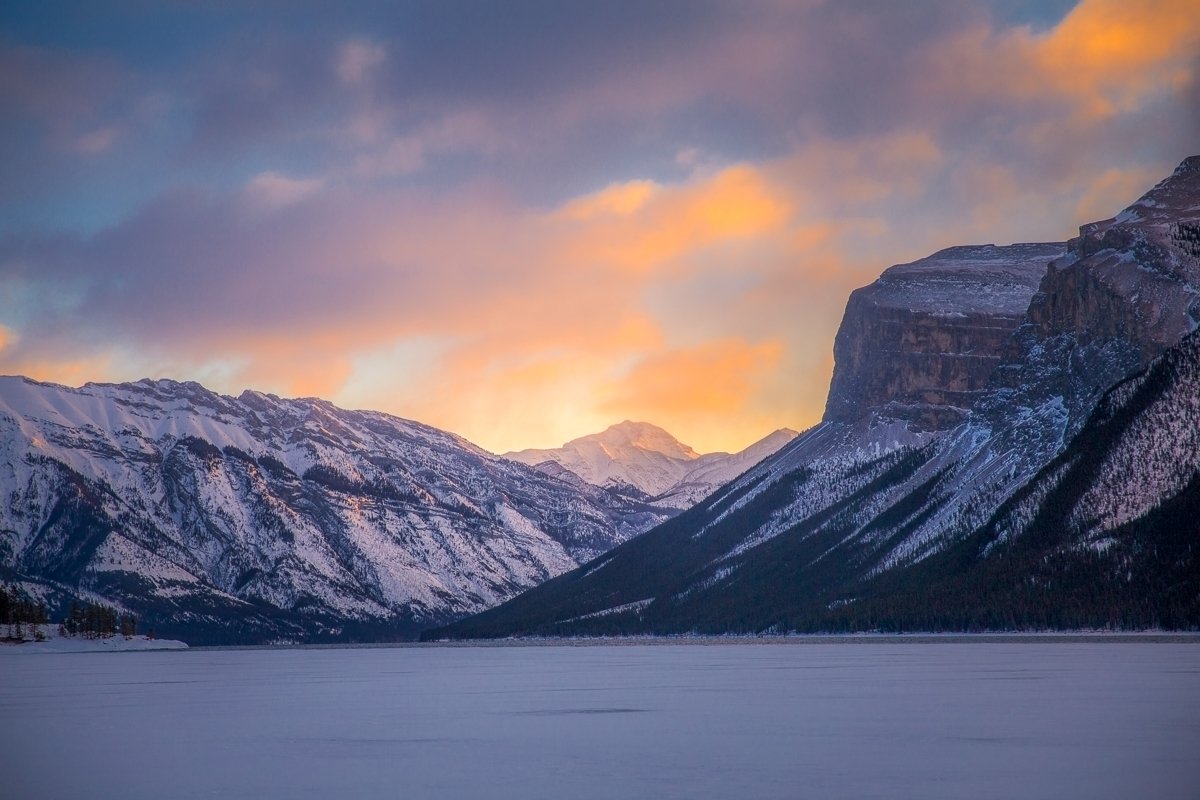 2×3, Alberta, Canada, Canadian Rockies, Lake, Lake Minnewanka, Landscape, Mountains, Snow, Sunrise, Winter