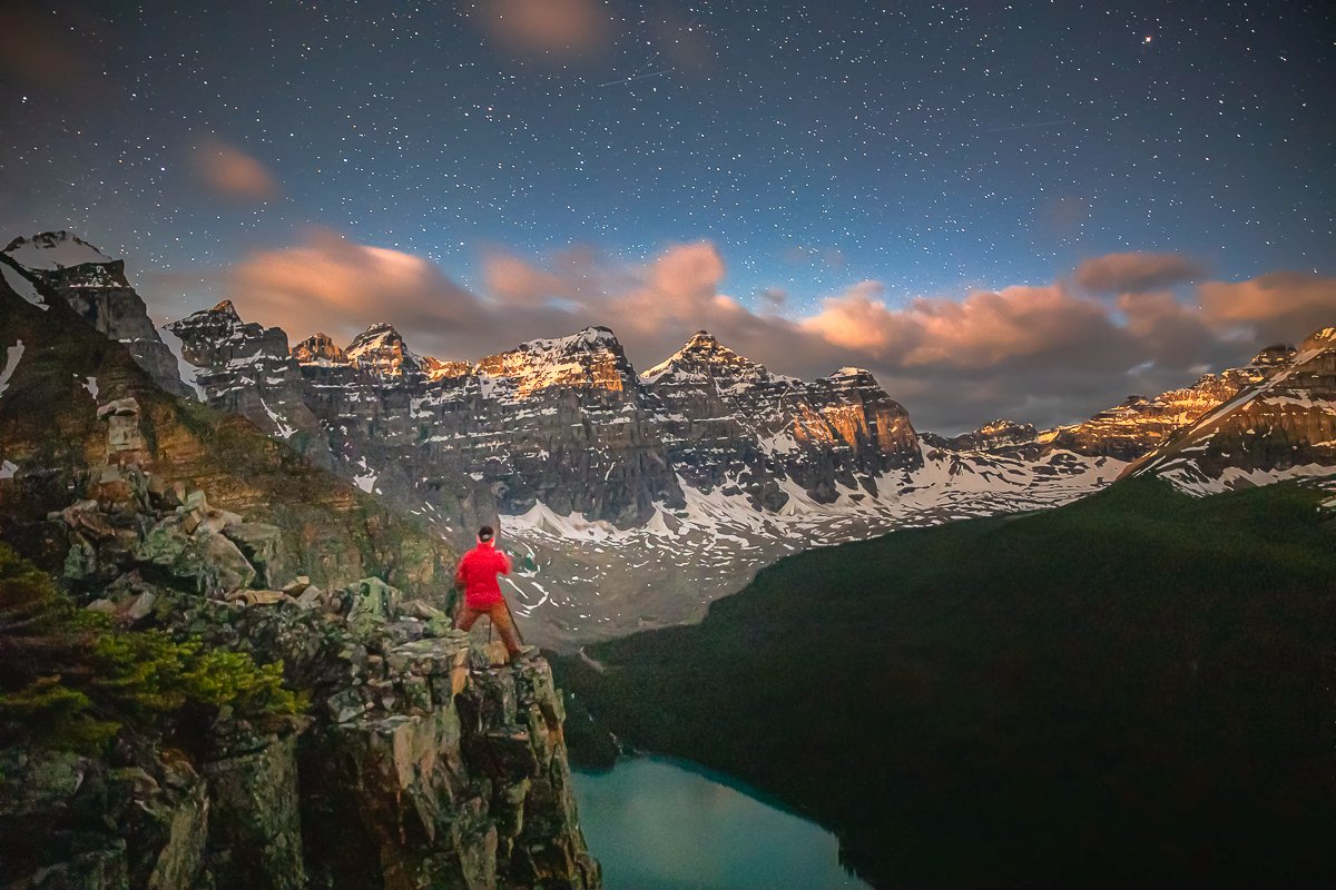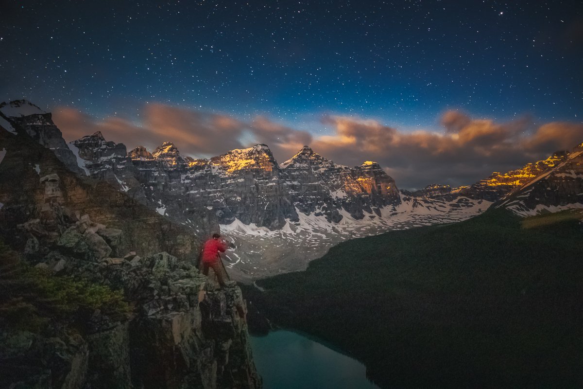 2×3, Alberta, Astrophotography, Canada, Canadian Rockies, Lake, Landscape, Milkyway, Moraine Lake, Mountain, Night, Stars, self-portrait