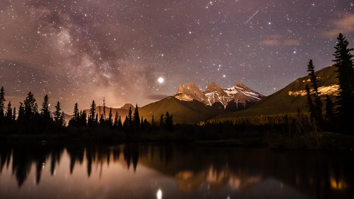 16×9, Alberta, Astrophotography, Banff national park, Canada, Canadian Rockies, Canmore, Lake, Milkyway, Mountain, Night, Stars, Three sisters