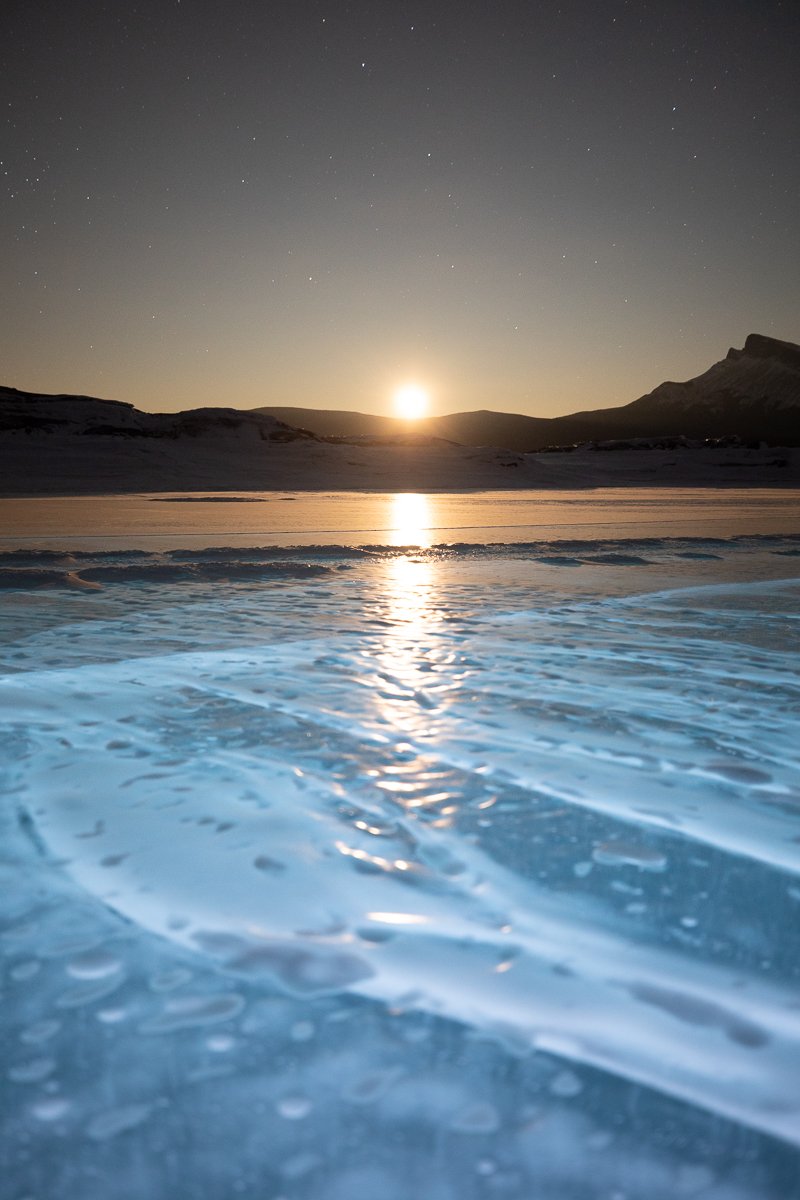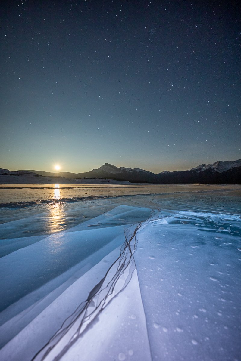 2×3, Abraham lake, Alberta, Astrophotography, Canada, Canadian Rockies, Frozen Lake, Lake, Landscape, Moon, Moon Halo, Mountains, Night photography, Stars, Winter