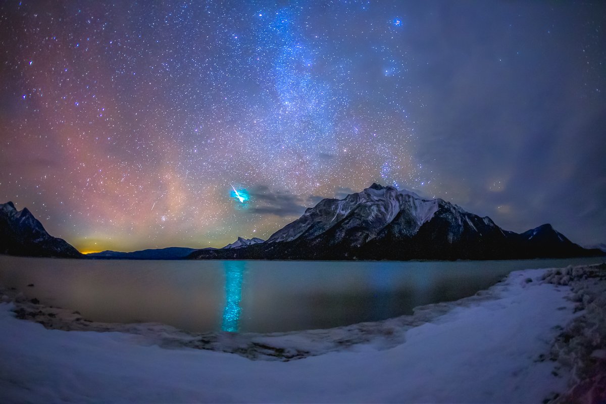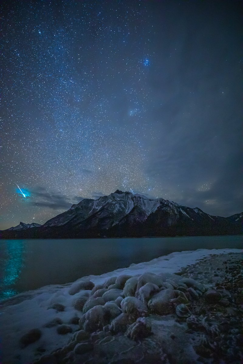 2×3, Abraham lake, Alberta, Astrophotography, Canada, Canadian Rockies, Frozen Lake, Geminid Meteor, Lake, Landscape, Mountains, Night photography, Stars, Winter