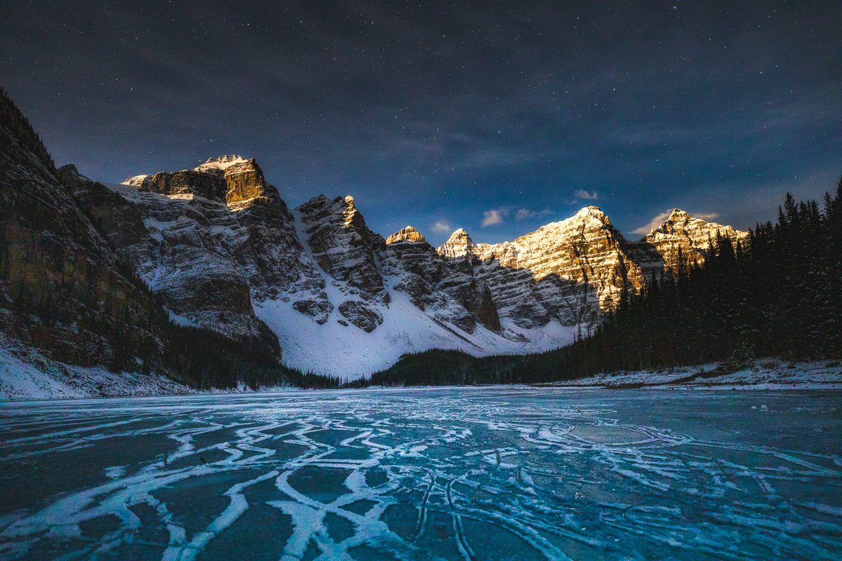 2×3, Alberta, Canada, Canada Rockies, Canadian Rockies, Frozen Lake, Landscape, Last day before road close, Moraine Lake, Night photography, Winter