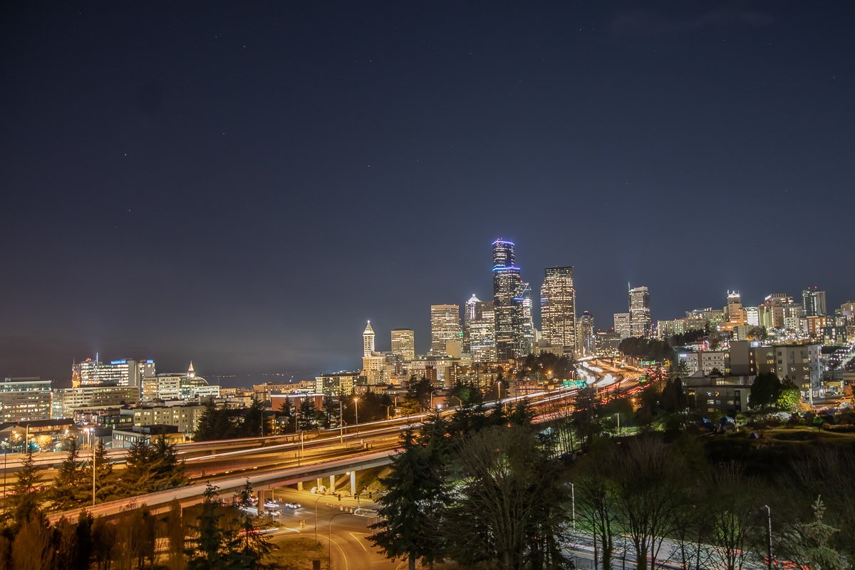 Cityscape, Light trails, Night, Seattle, Sunset, United States, Washington State