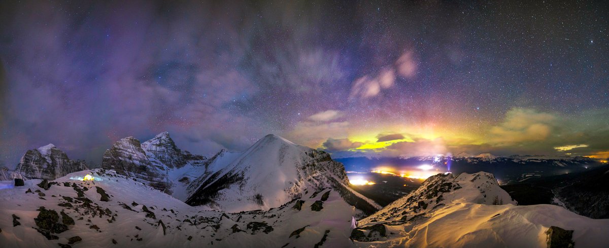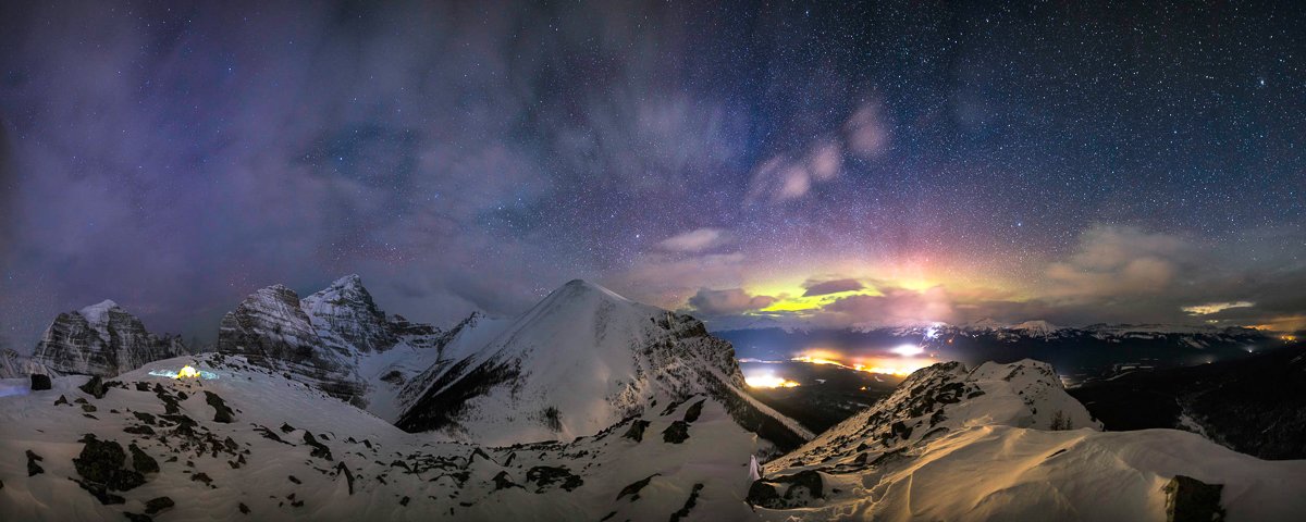 2×3, Alberta, Astrophotography, Canada, Canadian Rockies, Lake Louise, Landscape, Night, Snow, Stars, Winter, self-portrait
