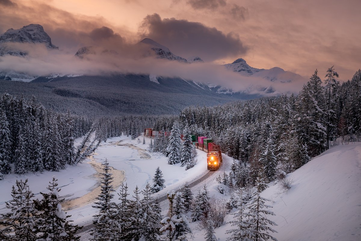 2×3, Alberta, Canada, Canadian Rockies, Icefield Parkway, Landscape, Morants Curve, Snow, Sunset, Train, Winter