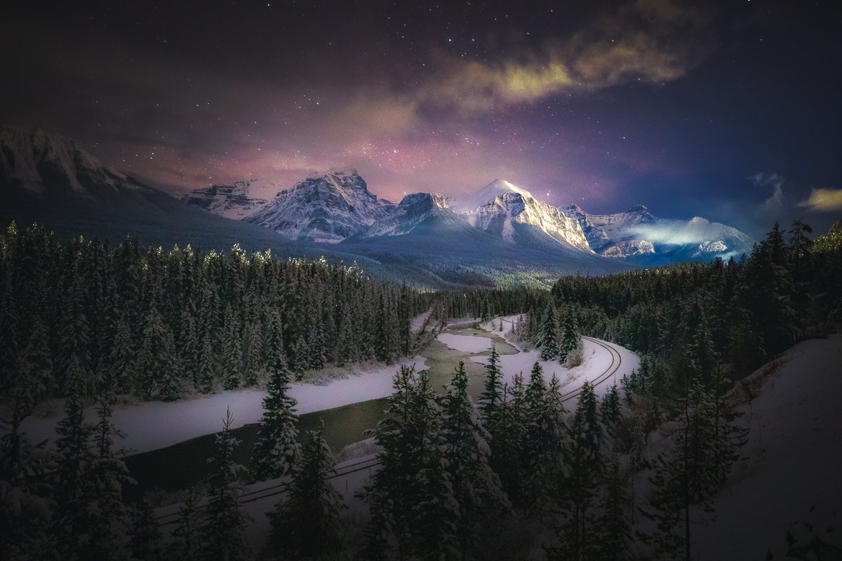 2×3, Alberta, Astrophotography, Canada, Canadian Rockies, Landscape, Morants Curve, Mountains, Night photography, Snow, Stars, Winter