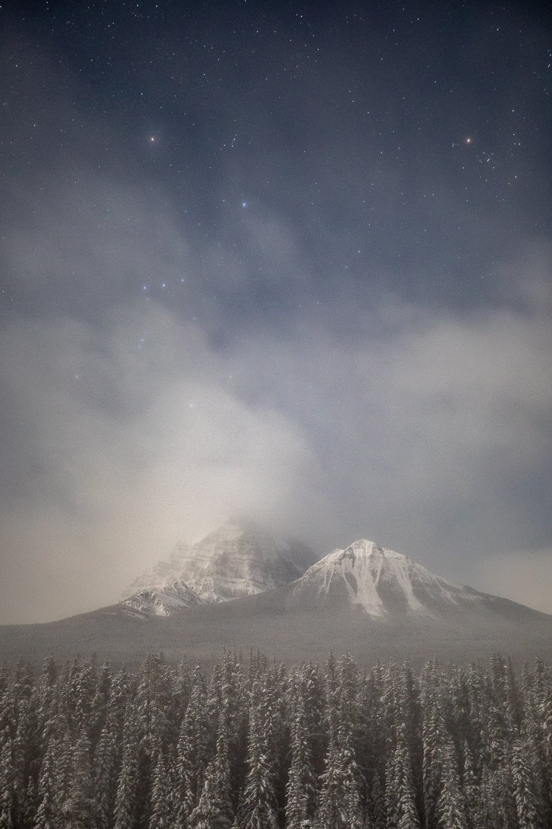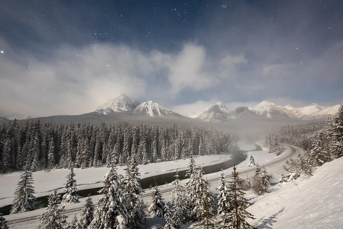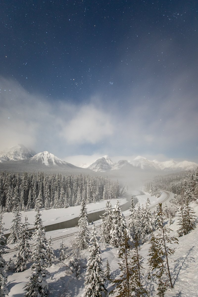 2×3, Alberta, Astrophotography, Canada, Canadian Rockies, Landscape, Morants Curve, Mountains, Night photography, Snow, Stars, Winter