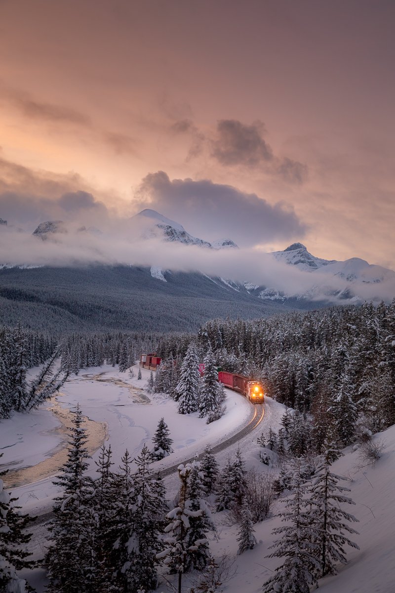 2×3, Alberta, Canada, Canadian Rockies, Icefield Parkway, Landscape, Morants Curve, Snow, Sunset, Train, Winter