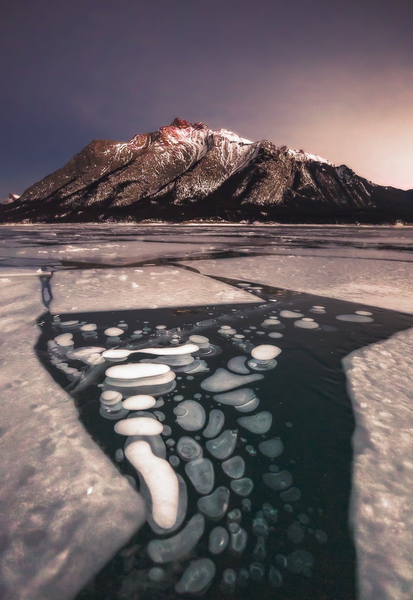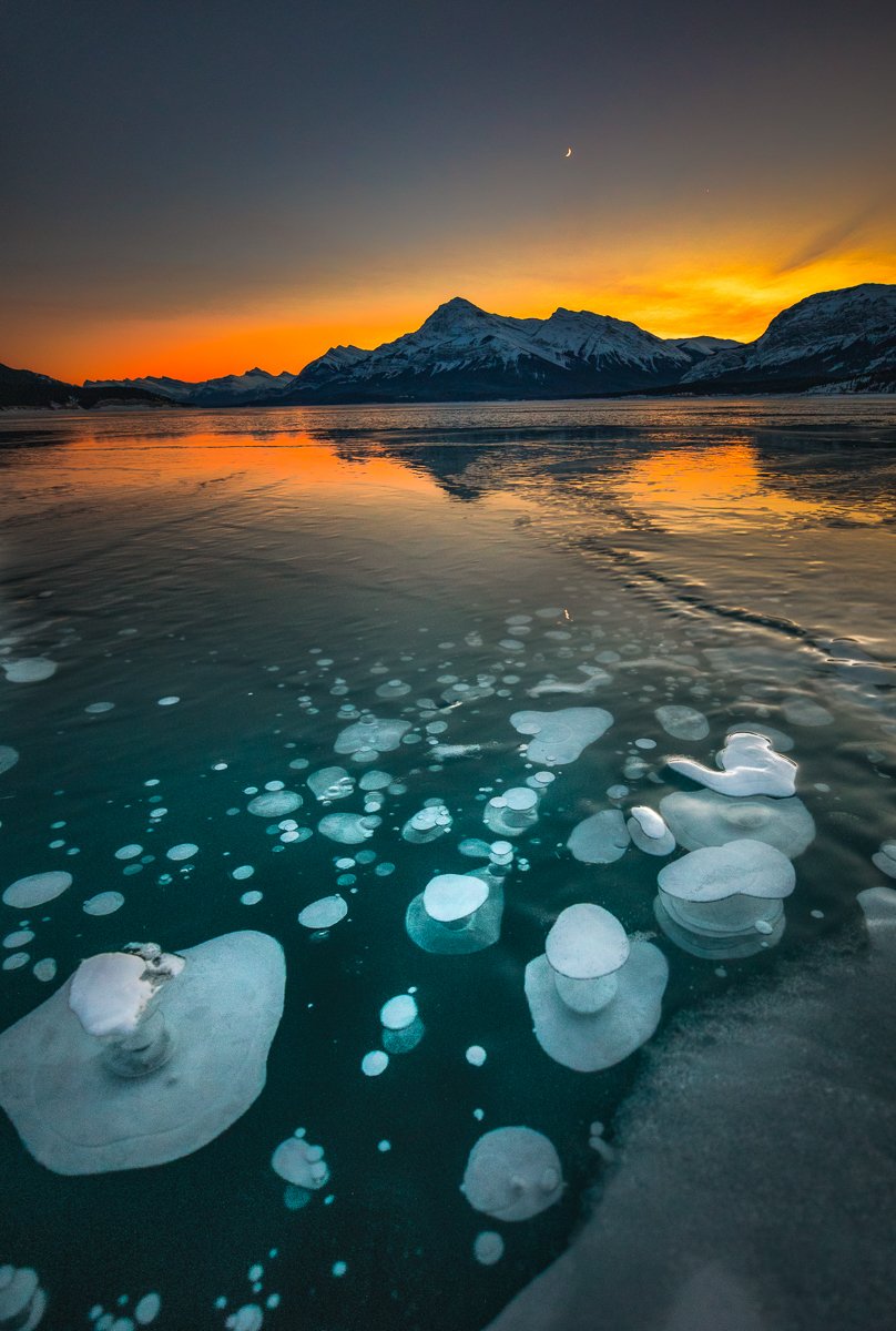 2×3, Abraham lake, Alberta, Canada, Canadian Rockies, Ice Bubbles, Lake, Landscape, Methane Bubbles, Mountains, Snow, Sunset, Winter