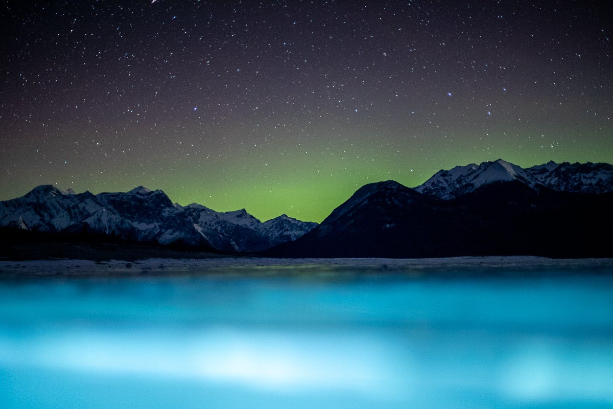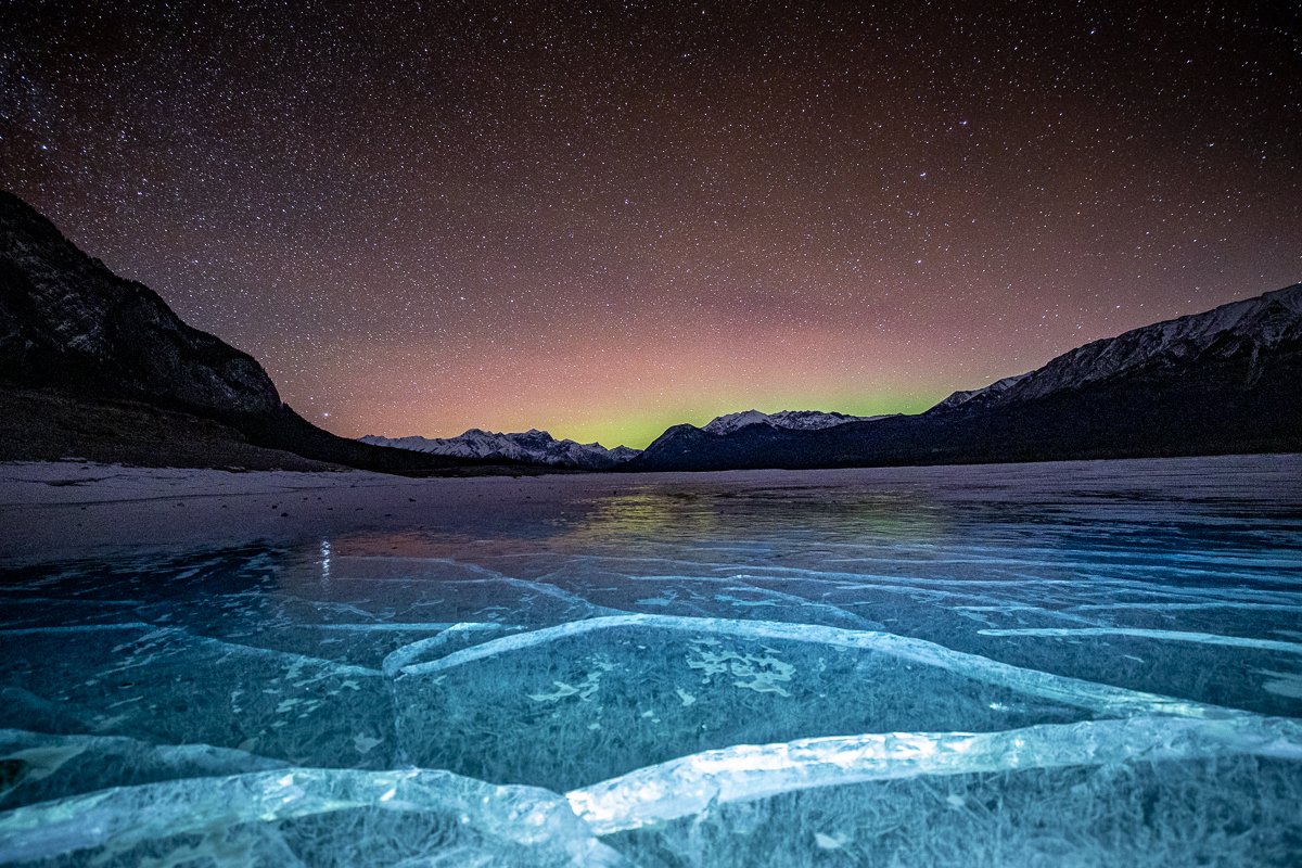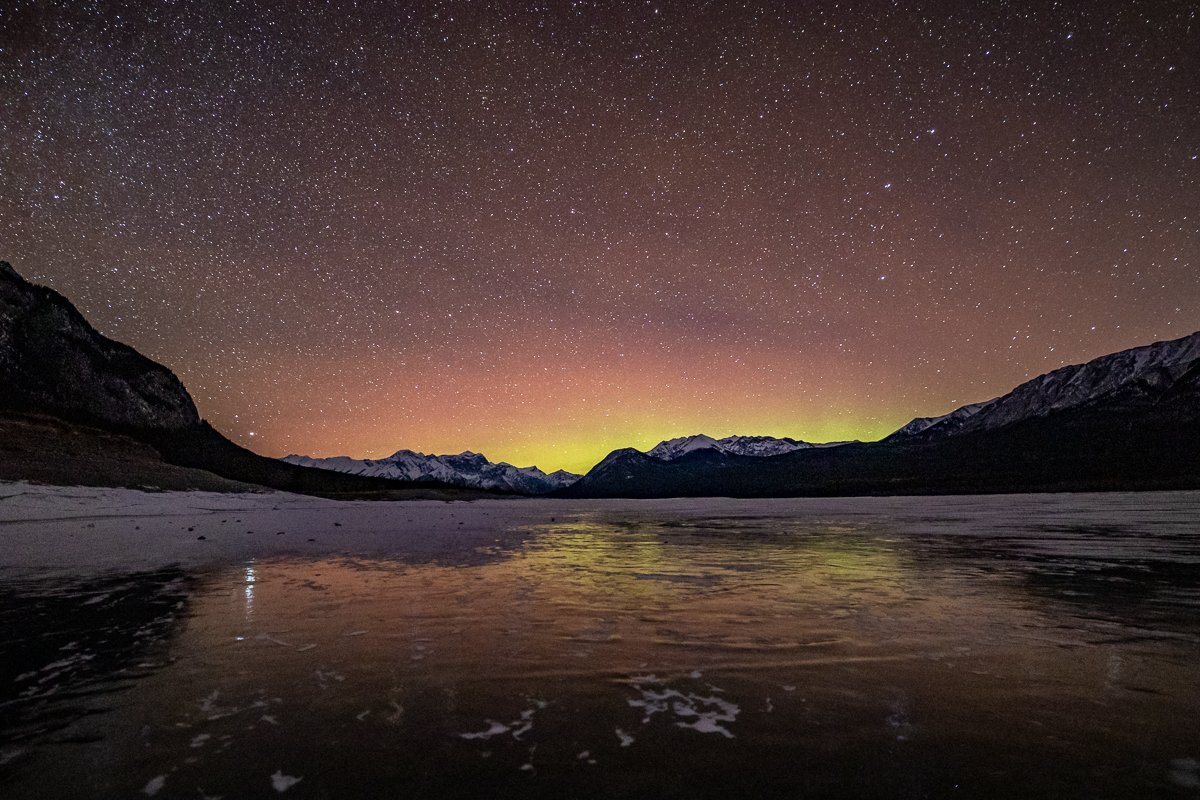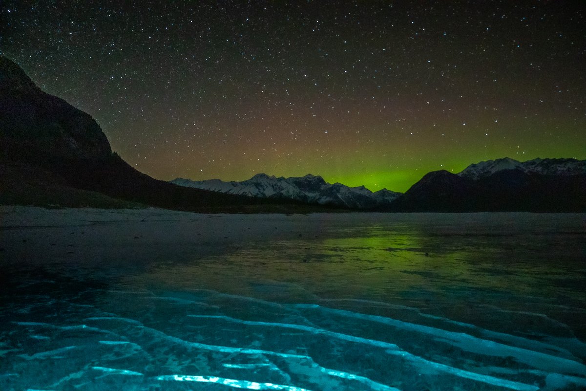 2×3, Abraham lake, Alberta, Astrophotography, Aurora Borealis, Canada, Canada Rockies, Canadian Rockies, Lake, Landscape, Mountains, Northern Light, Snow, Stars, Winter