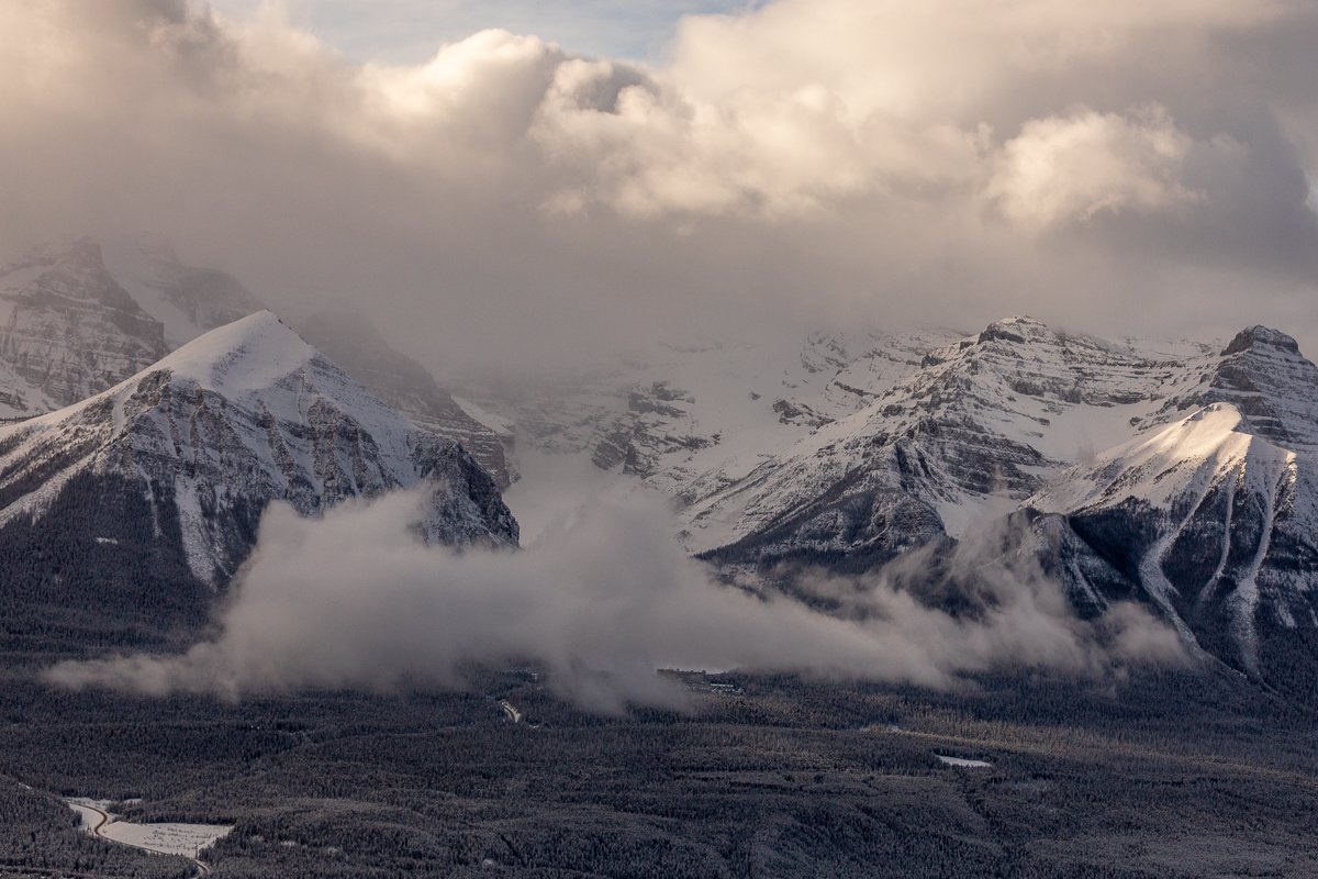 2×3, Alberta, Black and White, Canada, Canadian Rockies, Lake Louise, Landscape, Mountains, Snow, Sunset, Winter