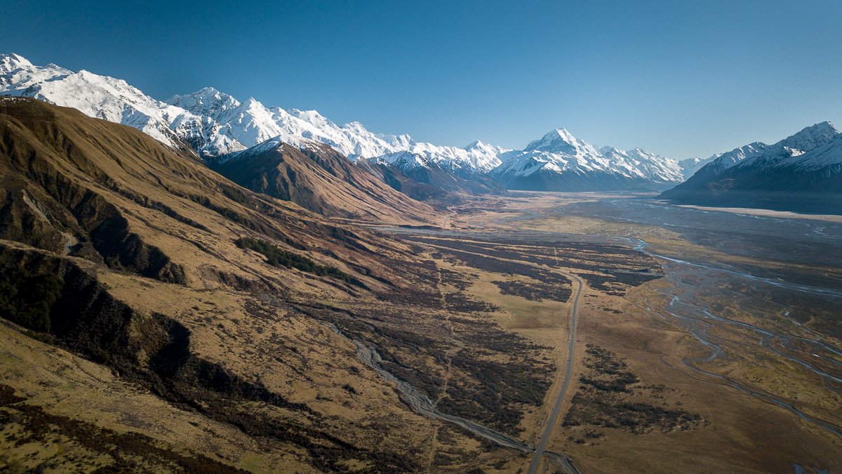 16×9, Aerial, Aerial Photography, Drone, Mountain, New Zealand, hooker valley, mt cook, south island