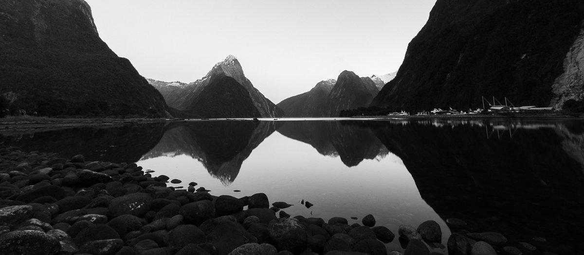 16×7, Black and White, New Zealand, Snow, Winter, milford Sound, south island