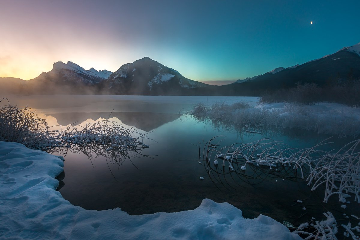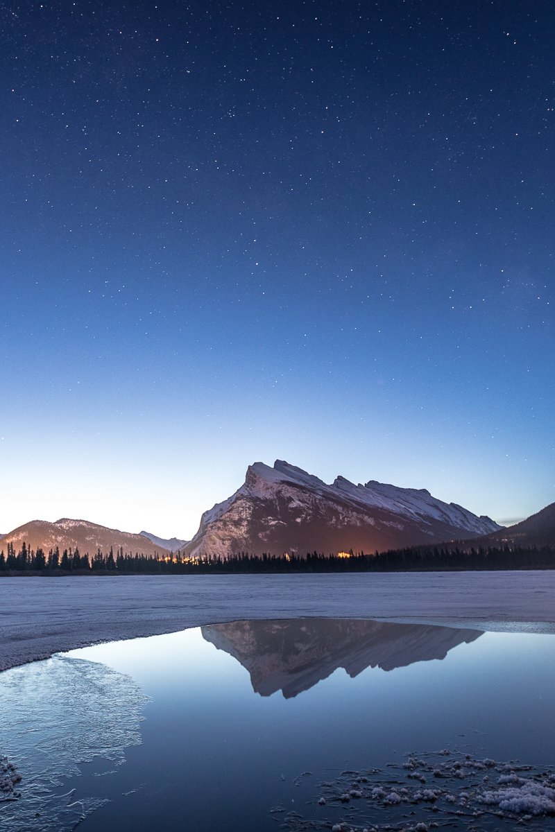 2×3, Alberta, Astrophotography, Banff national park, Canada, Canadian Rockies, Lake, Landscape, Mountain, Night, Snow, Stars, Vermillion Lake, Winter, banff